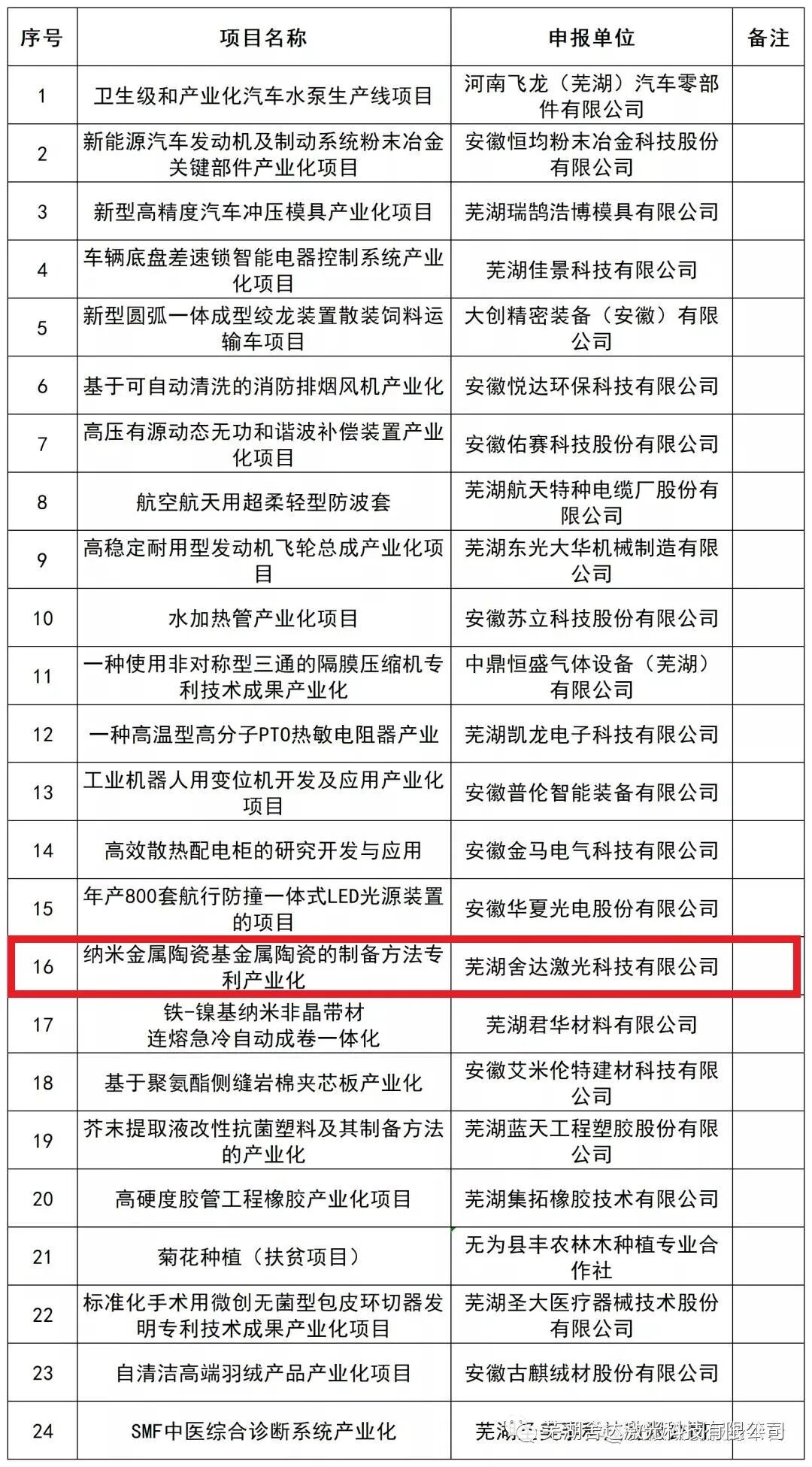 近日,芜湖市市场监督管理局(知识产权局)公示了2021年市发明专利技术成果产业化计划项目拟立项名单,全市共评审出24个拟立项项目,春谷3D打印产业园芜湖舍达科技有限公司申报的“纳米金属陶瓷基金属陶瓷的制备方法专利产业化”项目入选。